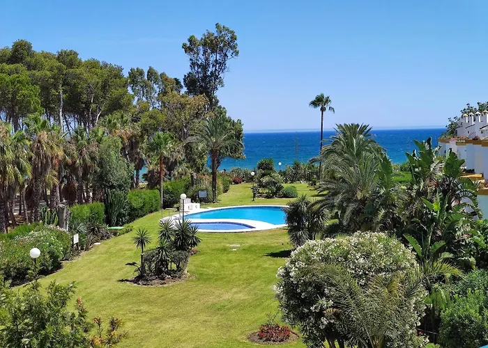 Spacious Beachfront Town House In Estepona With Fully Equipped Kitchen, Pools, Garden, Sea View Villa invita gli ospiti a praticare windsurf, snorkeling e badminton e si trova a una distanza di 3 km da siti naturali come l'Estepona Orchid House.